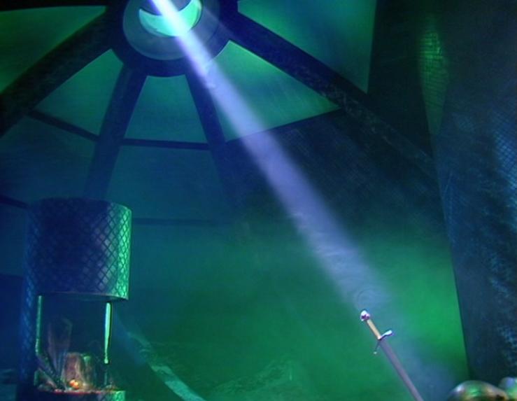 In the underground tunnel, Ace and the Doctor enter a strange room that obeys the Doctor’s commands. He presumes that the place was built by Merlin, and that he could possibly be Merlin in his own future. The facility is really a spacecraft for traveling between dimensions, and it contains King Arthur (in suspended animation) and Excalibur. Ace accidentally draws Excalibur, releasing an automated defense system. Ace runs the wrong direction and ends up trapped in an airtight chamber that fills with water. The Doctor manipulates some controls and continues to battle the defense system as Ace is ejected to the surface of the lake, echoing the Lady of the Lake legend as she emerges with Excalibur. She passes the sword to Ancelyn, Bambera, and Warmsly as Shou and Lethbridge-Stewart arrive.