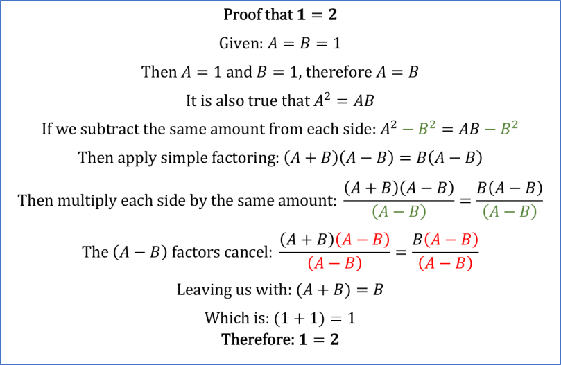 This is a story about the truth being in the details. Every mathematical operation that was conducted in the “proof” is legitimate, but the obscuring the simple details is what leads us to the wrong conclusion.